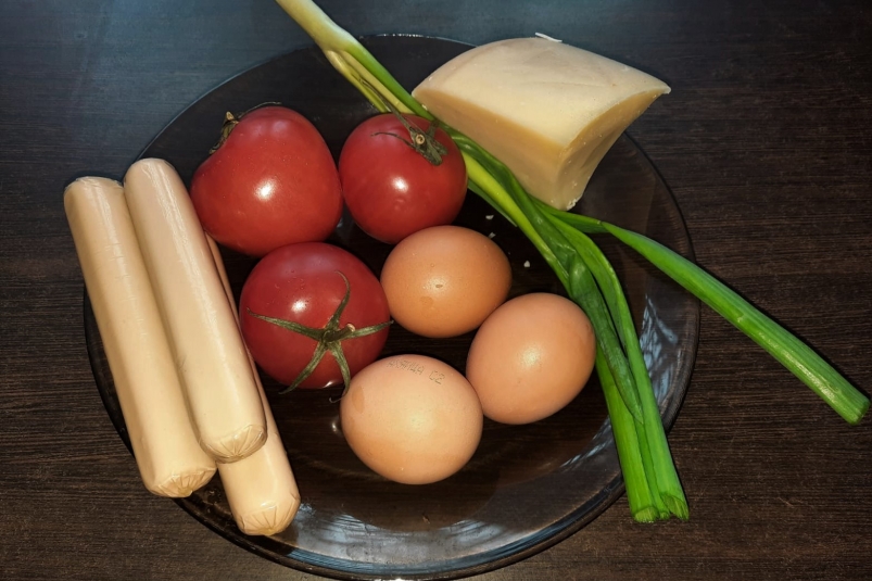 Для приготовления понадобится всего несколько яиц, сосиски, сыр и помидоры с зеленью. Чаще всего именно эти продукты легко "обнаружить" в холодильнике. Долго возиться с приготовлением блюда не придется. Всего несколько минут.