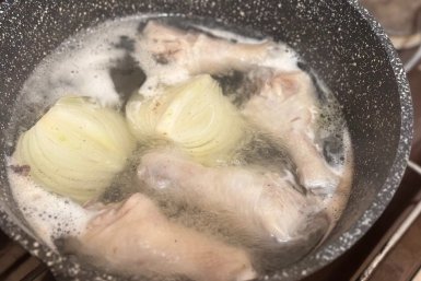 Картофель и яйца следует отварить и очистить, а затем нарезать кубиками. Маринованные огурцы нарежьте слайсами, а красный лук — полукольцами. Укроп мелко порубите.