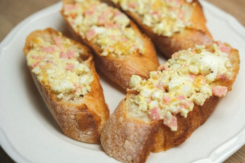 Отварите пять яиц вкрутую, остудите их и разрежьте каждое пополам. Один батон нарежьте на порционные куски, слегка смажьте их маслом.