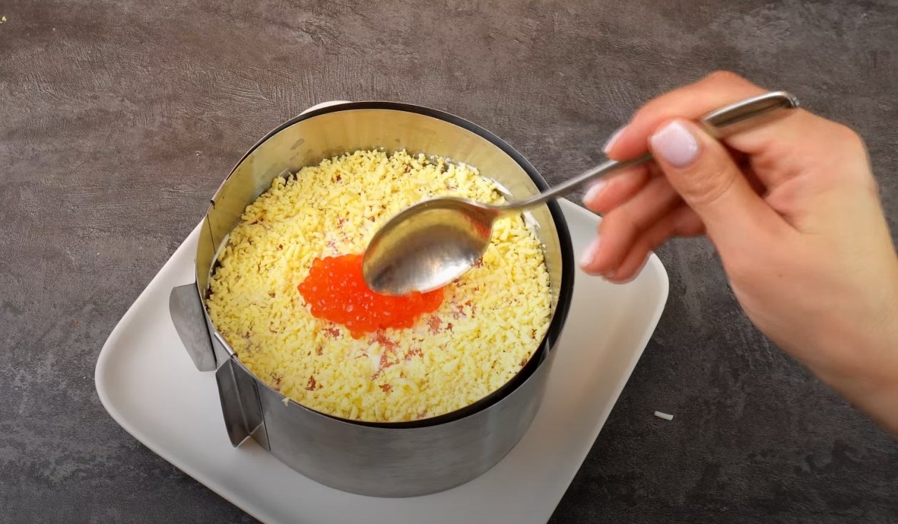 Перед подачей аккуратно снимите кольцо. Бока и верх можно украсить по своему усмотрению — например, веточками укропа и ложкой красной икры.