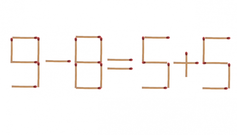 Перед вами неверное равенство, составленное из спичек: 9 — 8 = 5 + 5. Ваша задача — сделать его верным, переместив всего одну спичку. У вас есть 30 секунд! Не торопитесь, внимательно рассмотрите каждую цифру и знак. Возможно, ответ ближе, чем кажется.