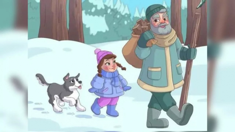 Посмотрите внимательно на картинку, предложенную нам художником. Вроде бы ничего необычного: дедушка со своей внучкой и питомцем идут по лесу. Они собирают дрова, чтобы растопить в доме печь.