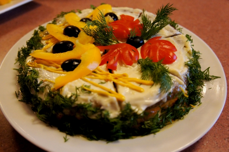 - Для украшения: 2 отварных яйца и небольшой пучок свежей зелени (укроп, петрушка).