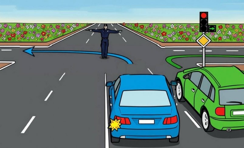 Представьте: инспектор ГИБДД стоит с раскинутыми или опущенными руками. Навстречу ему, со стороны груди, находится синий автомобиль. С другой стороны, к перекрестку подъезжает зелёная машина. Перед ней на светофоре горит зелёная стрелка, разрешающая поворот.