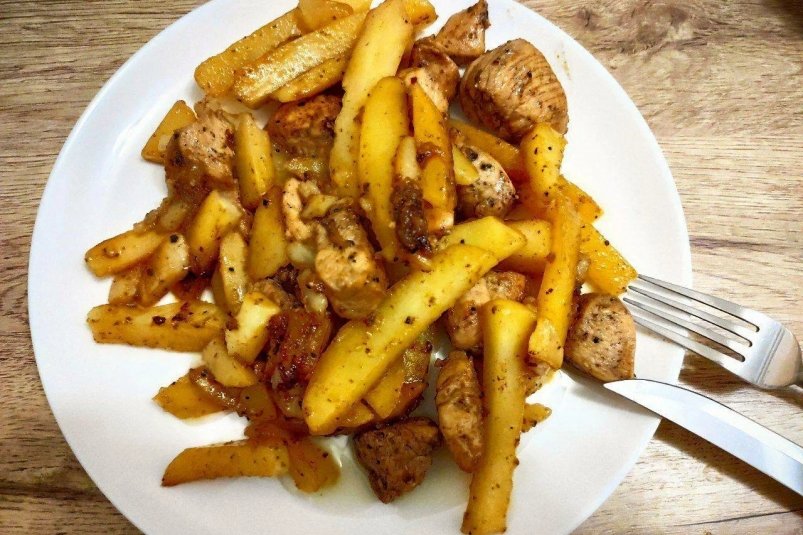 - Выкладываем и приправляем: разложите картофель на тарелке, посолите, поперчите и добавьте любимые специи. Можно положить кусочек сливочного масла, чтобы добиться более насыщенного вкуса.