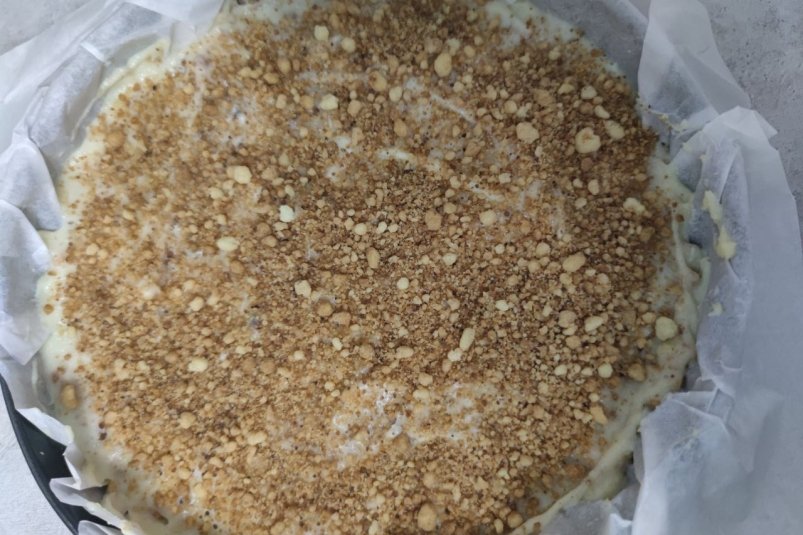 В форму для запекания, застеленную бумагой, выложите половину теста, распределите поверх него подготовленные яблоки и накройте оставшимся тестом. Посыпьте все охлаждённой крошкой.