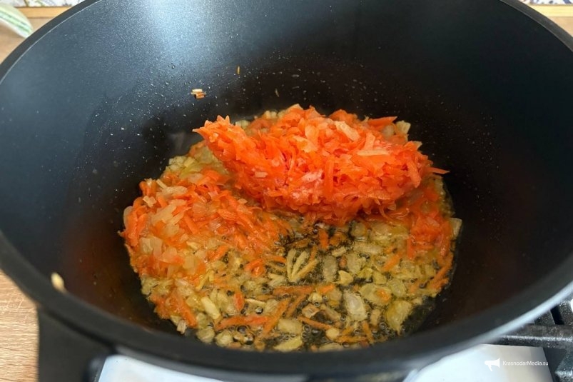Если хочется и вкусно, и просто, лучше всего работает проверенный классический способ: сначала лук, потом морковь. Зажарка получается ароматной, красивой, а посуду мыть не так хлопотно.