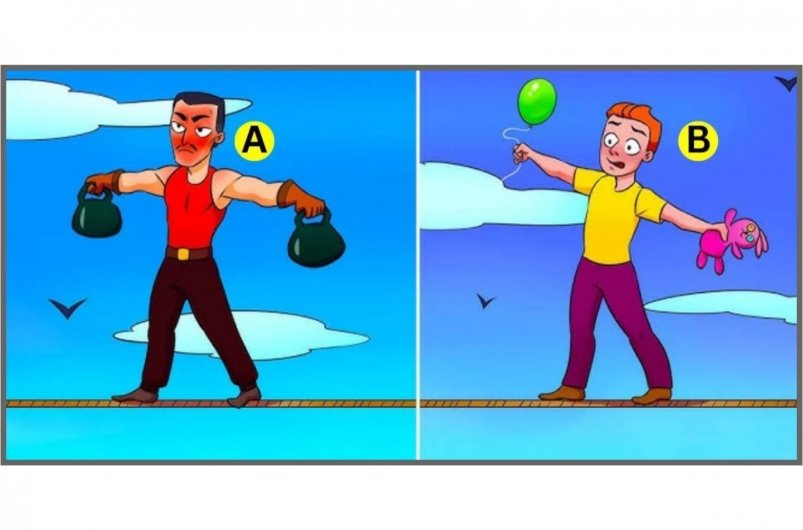 Второй мужчина держит мягкую игрушку и воздушный шар, которые не способствуют поддержанию равновесия на канате, поскольку для этого требуется симметричное распределение веса.