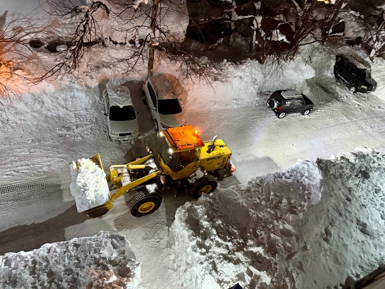 Обычный двор в Петропавловске-Камчатском. Последний раз снег убирали в середине декабря. После всех циклонов проезд полностью заблокирован уже две недели. Невозможно вывезти мусор, проехать пожарным и скорой, подвести товары в окрестные магазины. Попытка погрузчика пробиться в соседний двор закончилась крахом — спецтехника чуть не свалилась в яму со свежеоткопанным автомобилем, а потом превратила въезд в площадку для могула с трамплинами и ухабами.