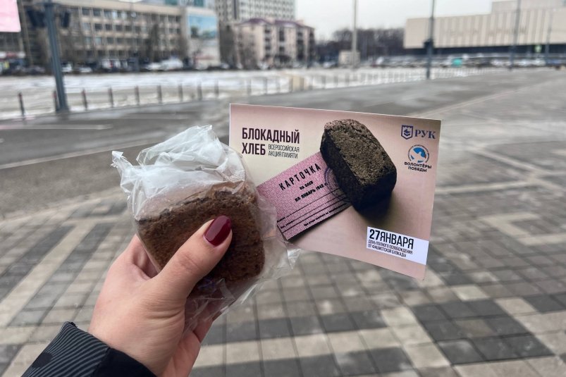 У Главной городской площади крайцентра и в сквере Жукова волонтеры раздают горожанам символические порции хлеба весом 125 гр. Кроме того, местные жители получают листовки с информацией о разрушениях и героях за 872 дня блокады.