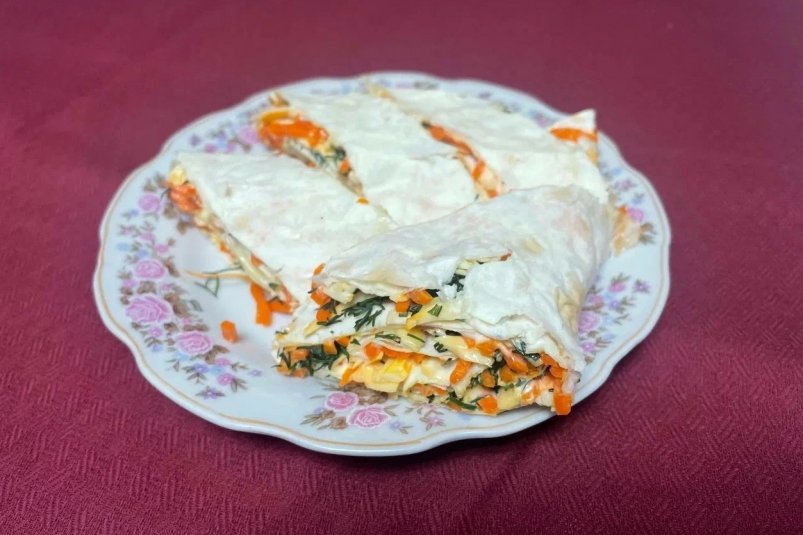 В этом рецепте сочетается нежность копченой курицы, пикантность корейской моркови, сливочность плавленого сыра и свежесть огурца. Получается идеальная начинка, которая отлично дополняет тонкий лаваш.