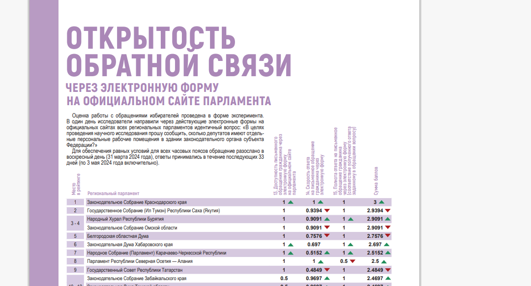 Край показал высокие результаты в работе с обращениями граждан. Исследователи отметили южный тренд развития парламентской открытости. Регион занял первое место в рейтинге обращений через электронную форму на официальном сайте парламента. Также ЗСК вошла в топ-3 по рассмотрению заявок через электронную почту.