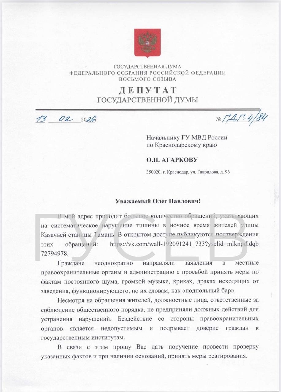 "В мой адрес приходит большое количество обращений, указывающих на систематическое нарушение тишины в ночное время жителей улицы Казачьей станицы Тамань. Граждане неоднократно направляли заявления в местные правоохранительные органы и администрацию с просьбой принять меры по фактам постоянного шума, громкой музыке, криках, драках, исходящих от заведения, функционирующего, по их словам, как "подпольный бар"", — говорится в обращении депутата.