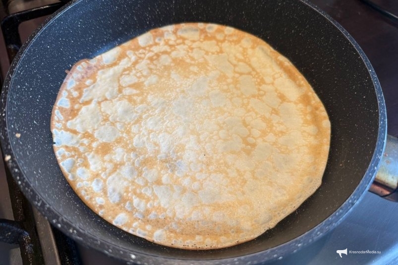 Тесто должно быть достаточно жидким. Настолько, чтобы легко растекаться по сковороде от одного движения руки. Лучше налить меньше теста и распределить его тонко, чем зачерпнуть полный половник и получить блин толщиной с палец.