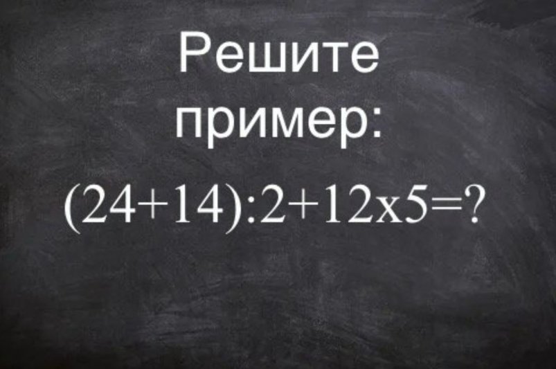 Попробуйте решить пример в уме, не записывая и не заглядывая в телефон: (24 + 14) : 2 + 12 × 5 = ?