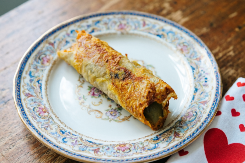 - Магия начинается: заворачиваем горячий огурец прямо в расплавленный сыр. При температуре около 150 градусов сыр превращается в хрустящий чипс, а внутри остается сочный огурец.