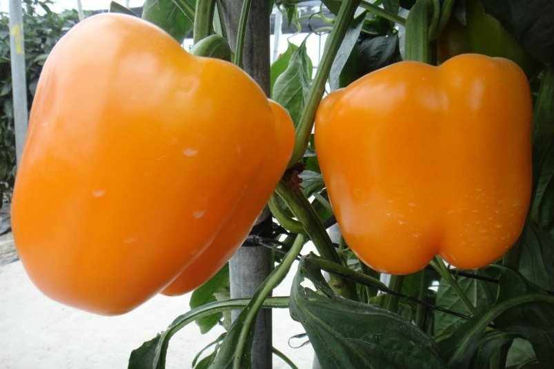 Первый урожай начинает радовать уже через 90-95 дней после прорастания семян. Перцы вырастают конусовидными, глянцевыми, желто-оранжевыми, весом от 120 до 200 граммов и толщиной стенки до 1 сантиметра. Некоторые экземпляры достигают 280 граммов.