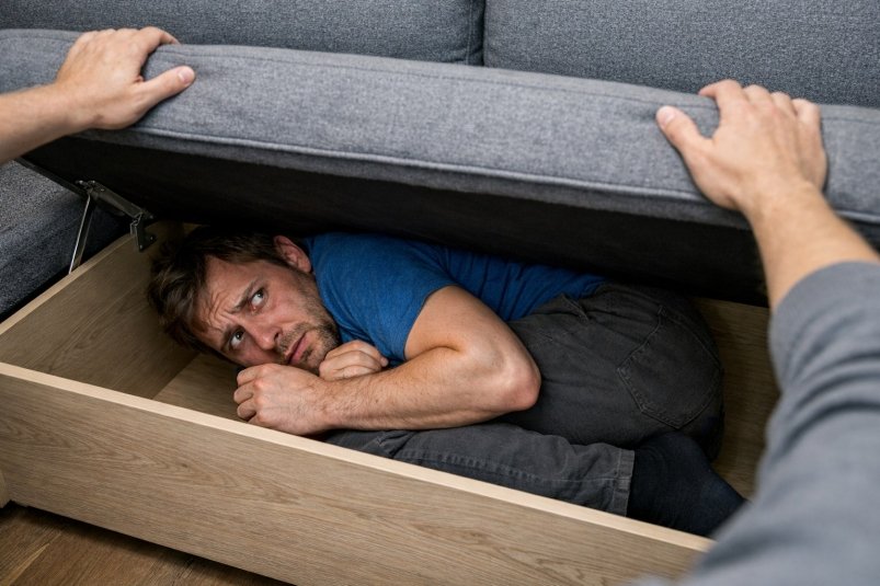 Судебный пристав решил осмотреть жилье. Он обошел все комнаты и уже перед выходом заглянул в раскладной диван, где в ящике для белья скрючившись в неудобной позе затаился должник. Поняв, что его нашли, мужчина вылез на свет: "Сдаюсь, сдаюсь!".