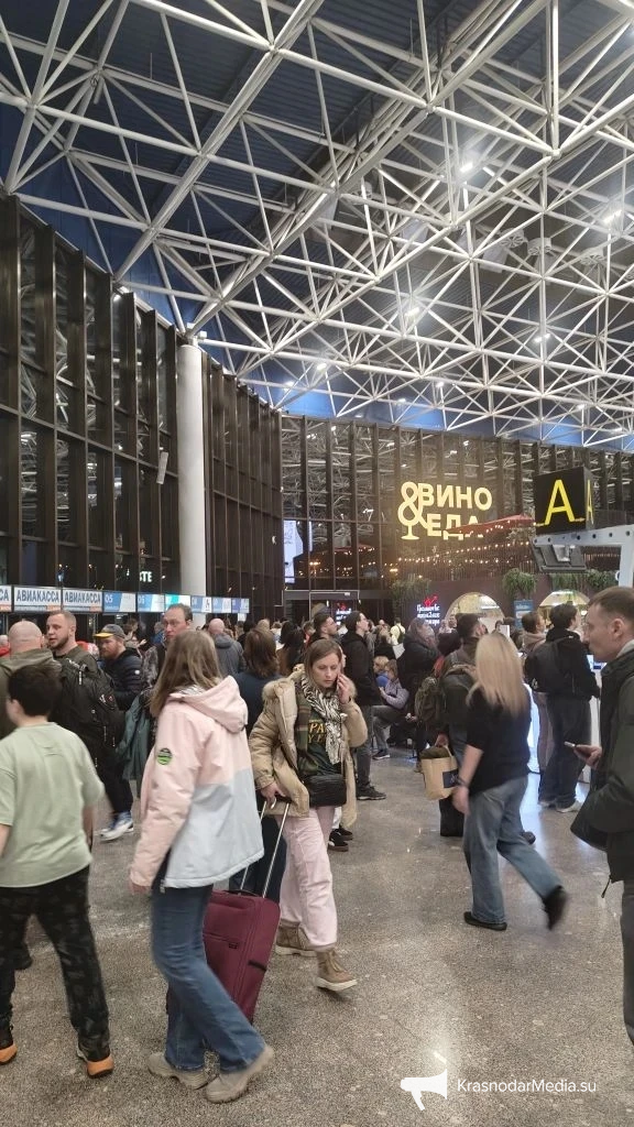 Как рассказали KrasnodarMedia пассажиры, которые в настоящий момент находятся в здании аэровокзала, в терминале большое скопление людей и, по их словам, перенос десятков рейсов, люди отмечают слаженную работу служб.