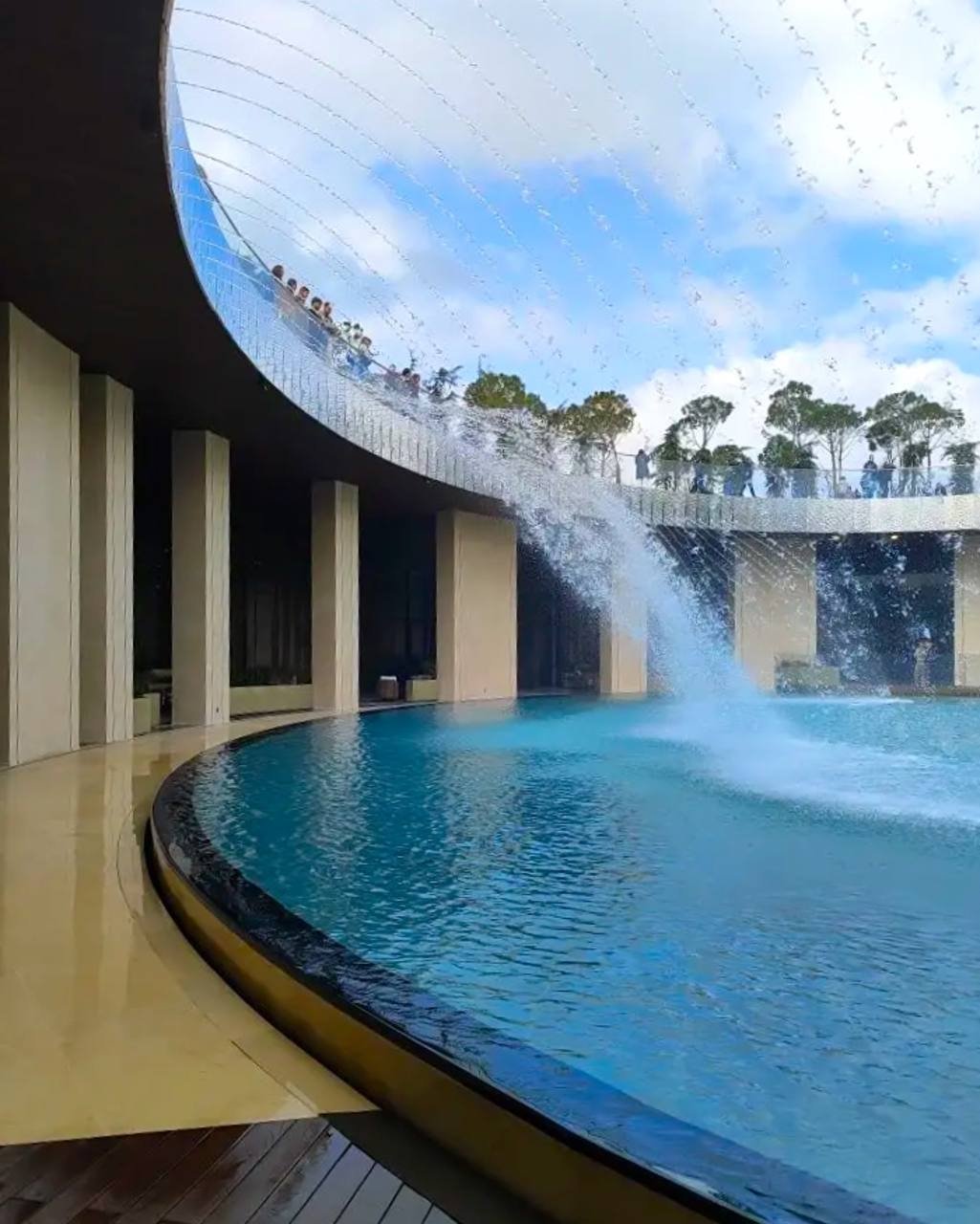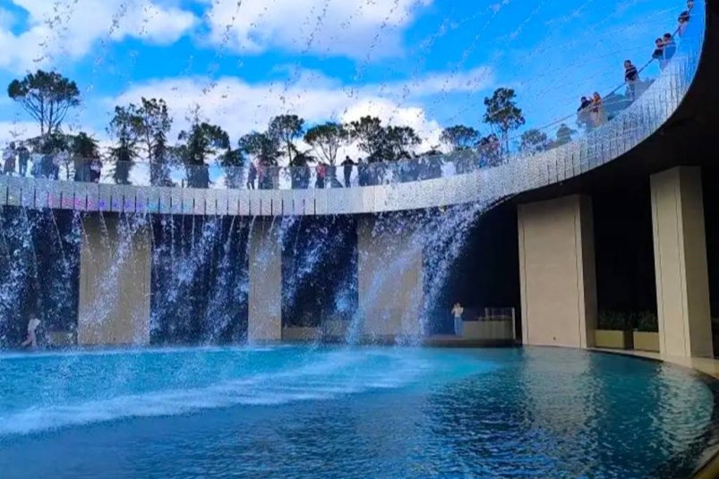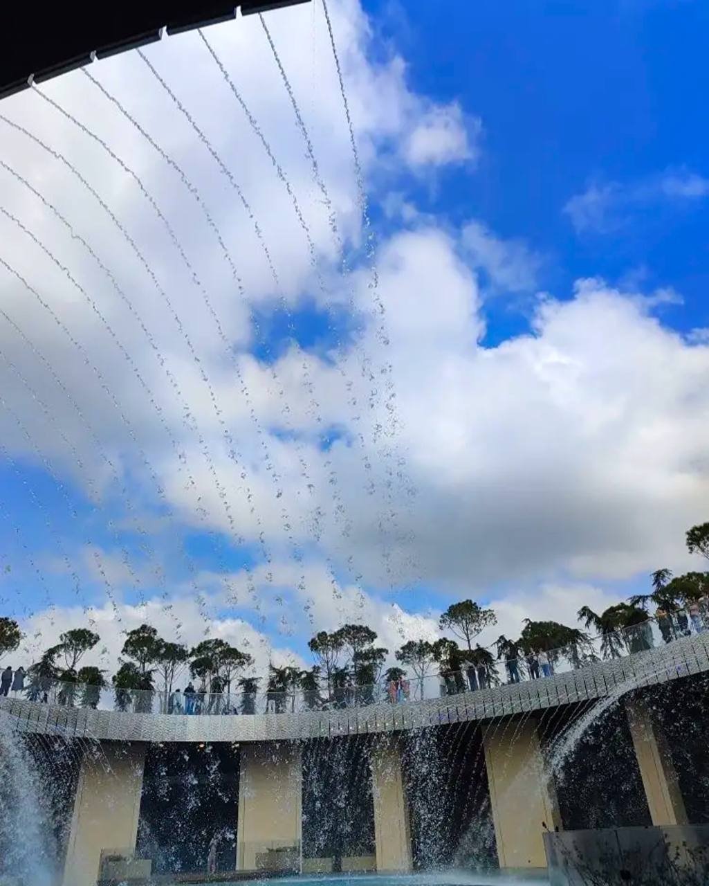 Водная инсталляция представляет собой чашу, по периметру которой вертикально падают струи воды. В настоящее время локация функционирует в режиме тестовой эксплуатации, специалисты завершают отделочные работы.