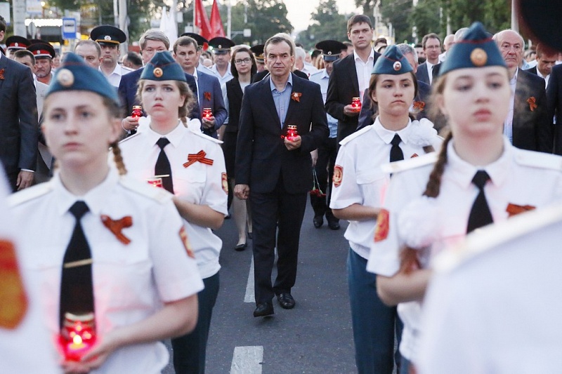 В народном шествии, посвященном Дню памяти и скорби, в столице Кубани приняло участие свыше 10 тысяч человек. Колонну возглавили глава края Вениамин Кондратьев и председатель Заксобрания края Владимир Бекетов. В мероприятии также участвовали вице-губернаторы, члены ветеранских и общественных организаций, молодежь, сообщает ИА KrasnodarMedia со ссылкой на сайт администрации Краснодарского края.