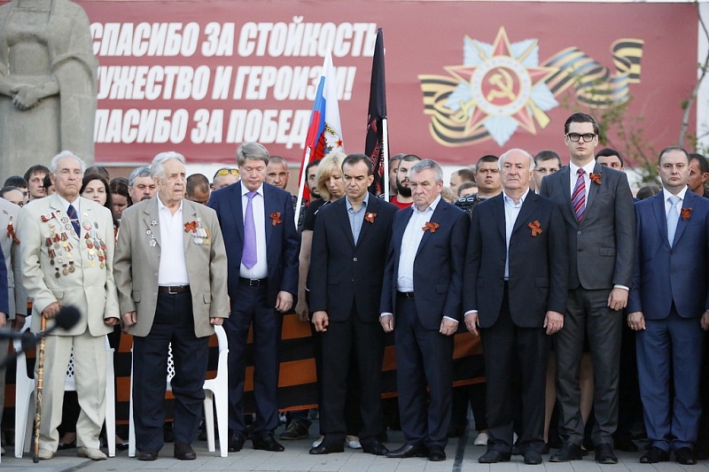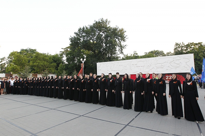 Участник Великой Отечественной войны Олег Бредихин обратился со словами благодарности ко всем горожанам, которые пришли отдать долг памяти своим дедам и отцам. Завершилось мероприятие вокально-хореографической композицией "Журавли" в исполнении хора и женской хореографической группы государственного концертного ансамбля "Кубанская казачья вольница" и песней "Вставай страна огромная".