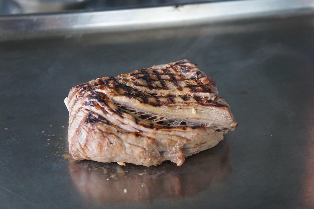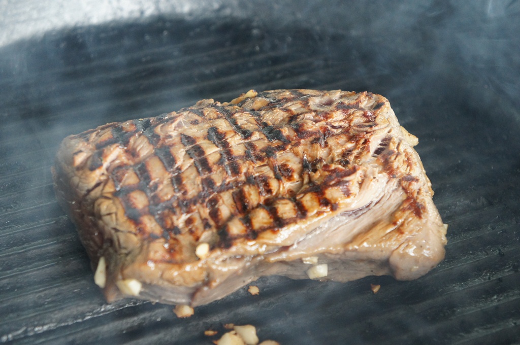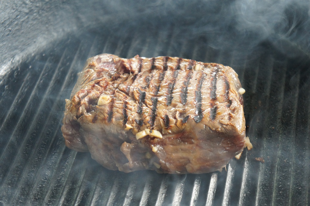 Хорошо нагреваем сковороду и на сильном огне без добавления масла обжариваем кусок с двух сторон до появления красивой корочки, а не до готовности.