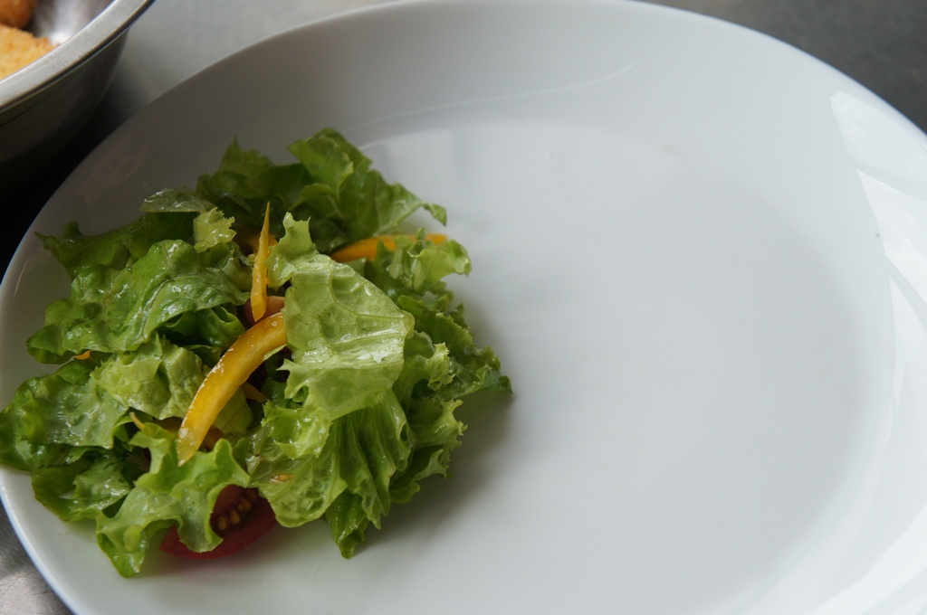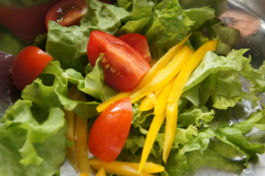 Выкладываем на тарелку микс-салат, тонко нарезанный сладкий перец, помидоры черри, немного соли, сбрызгиваем оливковым маслом и выжимаем сок половины лимона.