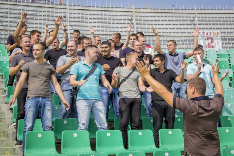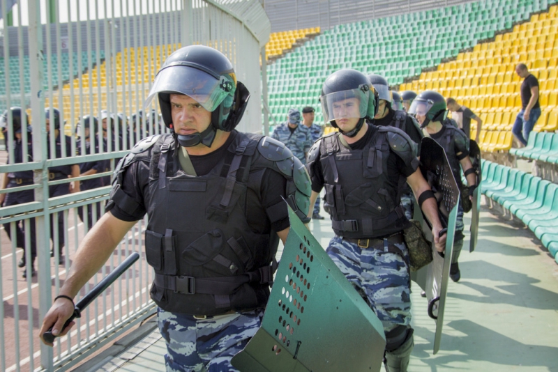При этом группа оцепления предотвращает выход болельщиков на поле и выстраивает коридор для сопровождения футбольных фанатов в автобусы. Аналогичные действия были отработаны на подступах к стадиону.