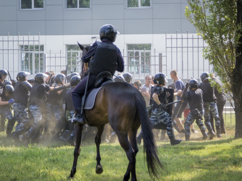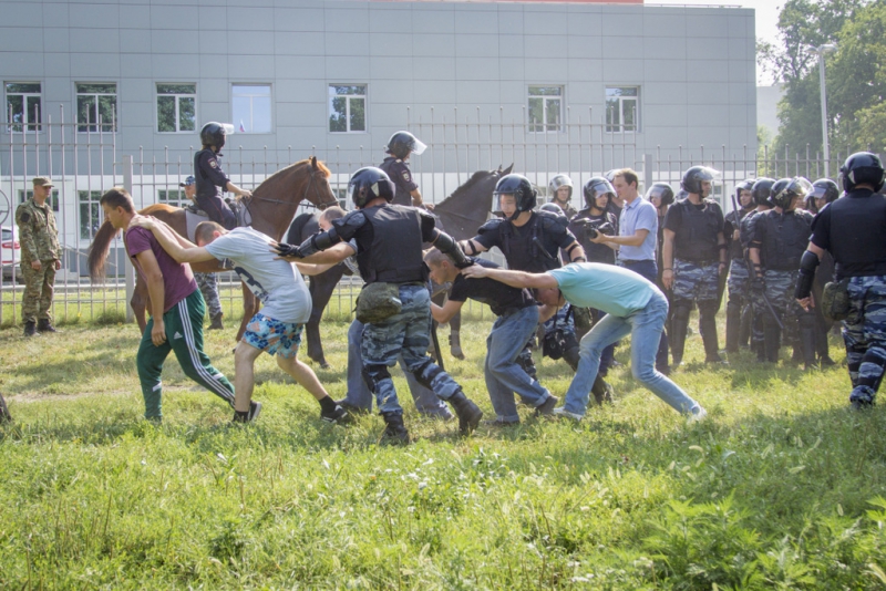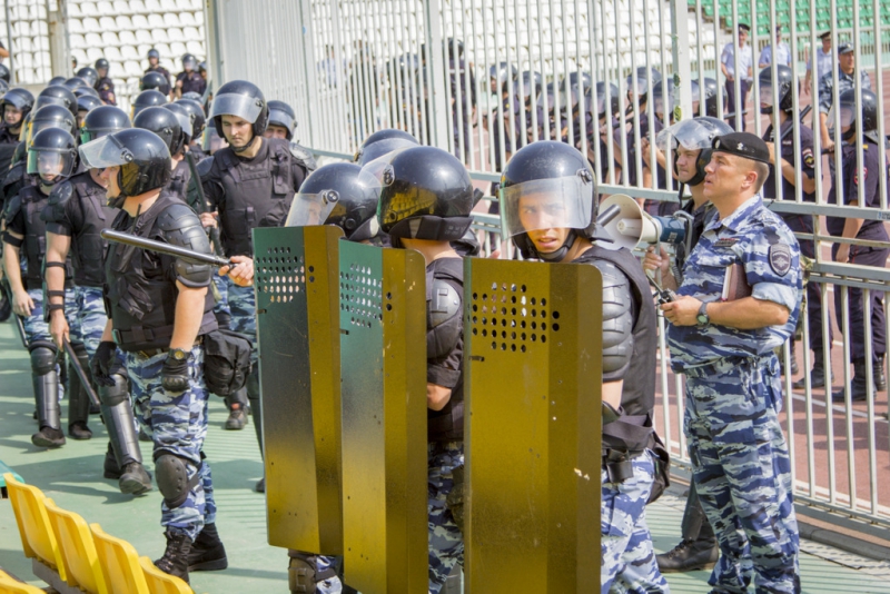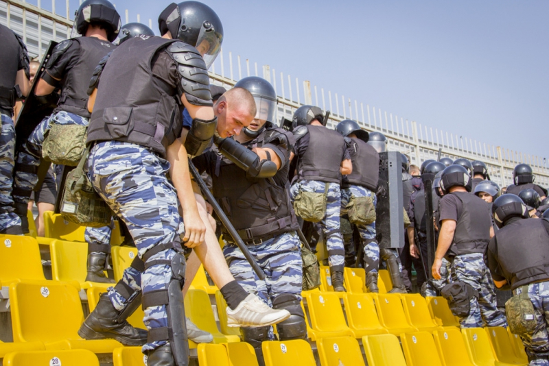 Полиция реагирует незамедлительно – группа резерва оцепляет участок, где происходит конфликт и рассекает толпу на две части, после чего по общей команде, применяя в соответствии с ФЗ "О полиции" физическую силу и спецсредства, начинает вытеснять болельщиков к выходу из сектора.