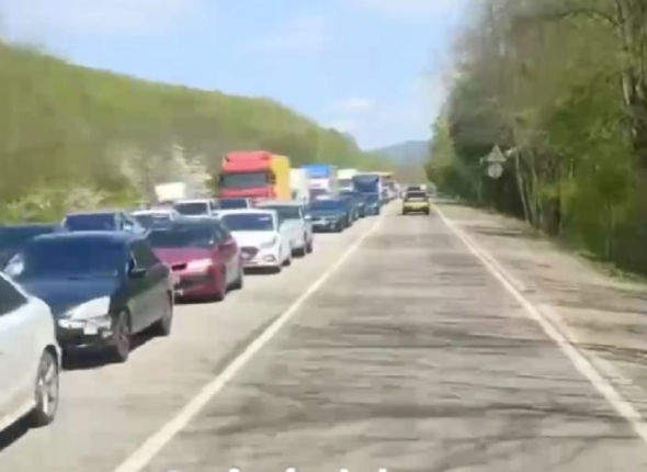 Подписчики местного телеграм-канала (18+) рассказали, что в среду 19 апреля гигантская очередь авто скопилась в районе Горячего Ключа по дороге на Джубгу — традиционное "пробочное" место в летний сезон.
