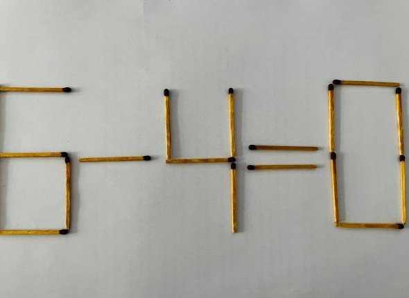 Посмотрите на неверное равенство, выложенное спичками: 6-4=0. Ваша задача — переставить всего две спички так, чтобы пример стал верным. Звучит просто? Но есть важное условие, постарайтесь найти решение самостоятельно, не прибегая к помощи нейросетей или поиска в интернете. И еще одно, вам нужно уложиться в 30 секунд. Время пошло!