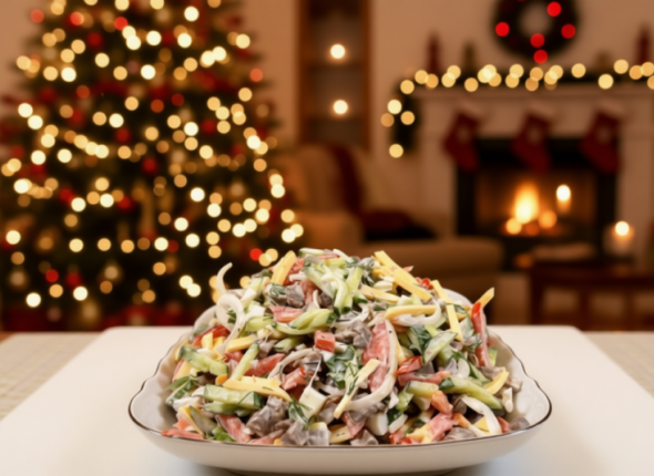 KrasnodarMedia, 23 декабря 2025. Новогодний стол украсит необычный салат, который станет настоящей находкой. Он сочетает в себе сочность овощей, нежное обжаренное мясо, пикантные сырные шарики и хрустящие сухарики с ароматной заправкой. Рецептом салата "Новогодний" делится кулинарный блогер Оксана Пашко.