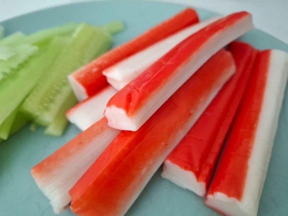 Яйца отварите вкрутую, очистите и отделите белки от желтков. Белки натрите на крупной терке, желтки отложите для украшения. Рис отварите до готовности в подсоленной воде, откиньте на дуршлаг и полностью остудите. Крабовые палочки и огурец нарежьте аккуратным кубиком среднего размера.