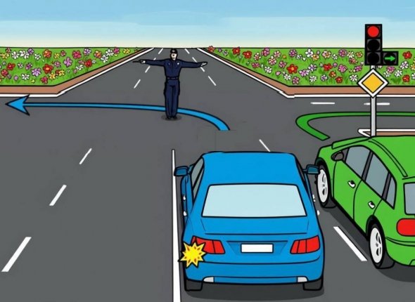 Вывод: Оба водителя обязаны оставаться на месте и ждать смены сигнала регулировщика.