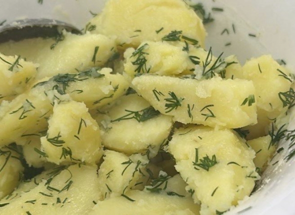 Главное — витамины все остаются в картошке, а не в воде. Готовится в своем соку. Для пюре достаньте горячую картошку, добавьте масло и теплое молоко — будет без комочков. Для гарнира разрежьте пополам и посыпьте укропом.