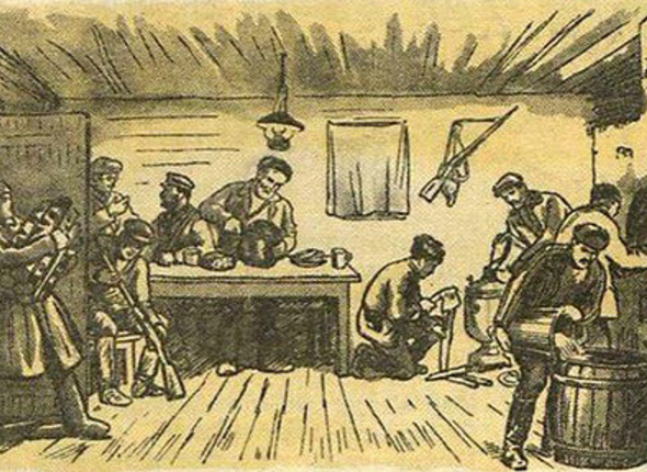На картинке в журнале было изображено обычное партизанское жилье: один боец колет дрова, другой чистит ружье, третий готовит еду. А сам "Федор" взялся помочь — начал наливать воду из ведра в… дымовую трубу самовара.