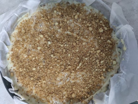 В форму для запекания, застеленную бумагой, выложите половину теста, распределите поверх него подготовленные яблоки и накройте оставшимся тестом. Посыпьте все охлаждённой крошкой.