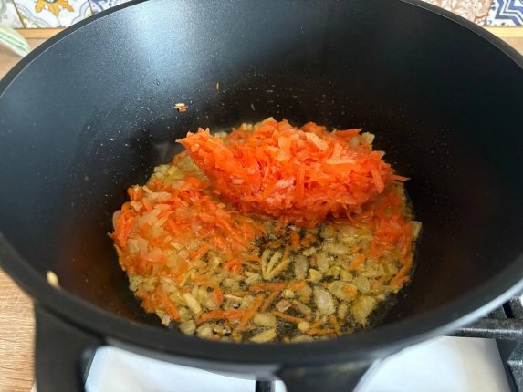 Если хочется и вкусно, и просто, лучше всего работает проверенный классический способ: сначала лук, потом морковь. Зажарка получается ароматной, красивой, а посуду мыть не так хлопотно.