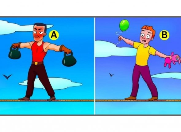 Второй мужчина держит мягкую игрушку и воздушный шар, которые не способствуют поддержанию равновесия на канате, поскольку для этого требуется симметричное распределение веса.