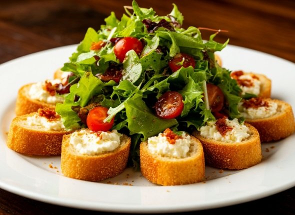 Перед подачей салат можно украсить свежей зеленью. Можно подойти к подаче творчески и наложить его на гренки.