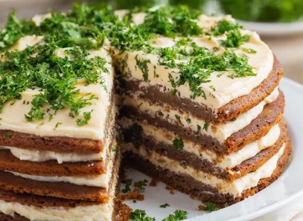 Рецепт может показаться современному человеку необычным, но он определённо заслуживает внимания. Экспериментировать с начинкой тоже можно — например, добавив между коржами обжаренные грибы или консервированный горошек для нового вкусового оттенка.