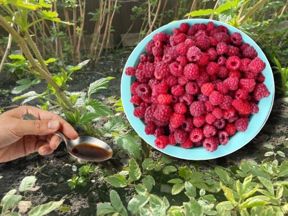 Если с осени удобрения не вносились, весной малину нужно подкормить. Хорошо работает такой состав на 10 литров воды:
