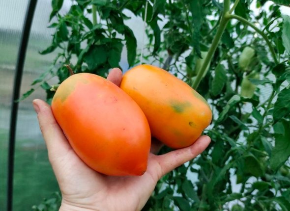 Данный сорт характеризуется интенсивным плодоношением независимо от погодных условий. Растение обильно покрывается плодами, формируя до пяти штук на одной кисти. Плоды отличаются плотной кожицей и мясистой мякотью. Томаты имеют цилиндрическую форму и достигают массы до 175 граммов.