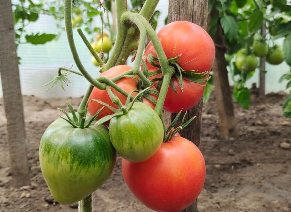 Данный сорт характеризуется крупными плодами, средний вес которых достигает 300 граммов. Высота куста может достигать 1,2 метра в тепличных условиях и до 60 сантиметров в открытом грунте. На одной кисти формируется до 6 плодов.