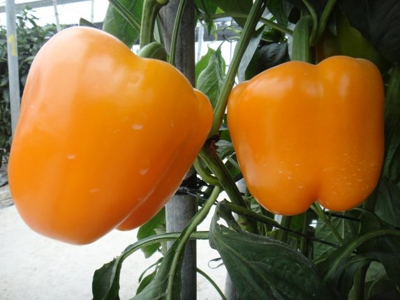 Первый урожай начинает радовать уже через 90-95 дней после прорастания семян. Перцы вырастают конусовидными, глянцевыми, желто-оранжевыми, весом от 120 до 200 граммов и толщиной стенки до 1 сантиметра. Некоторые экземпляры достигают 280 граммов.