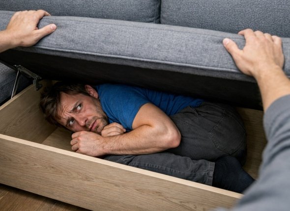Судебный пристав решил осмотреть жилье. Он обошел все комнаты и уже перед выходом заглянул в раскладной диван, где в ящике для белья скрючившись в неудобной позе затаился должник. Поняв, что его нашли, мужчина вылез на свет: "Сдаюсь, сдаюсь!".