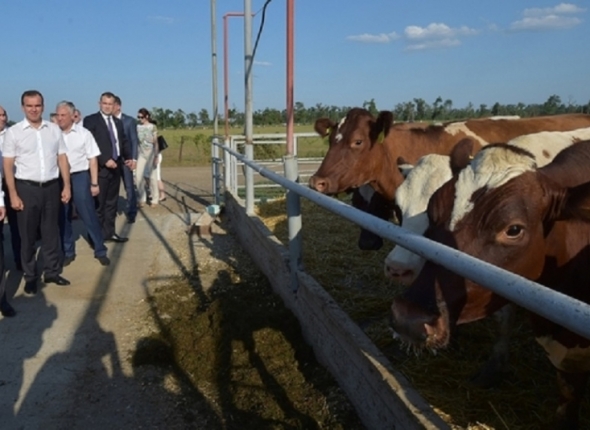 "Свой рабочий день Медведев начал с вертолетного облета сельхозугодий и осмотра крестьянско-фермерского хозяйства "Ильченко Ю. В." – крупнейшего в Динском районе. Компанию ему составил первый заместитель министра сельского хозяйства РФ Джамбулат Хатуов. Как пишет "Московский комсомолец", "премьеру показали идеальное животноводческое хозяйство, в котором буренки слушают Стаса Михайлова и питаются натуральными кормами".